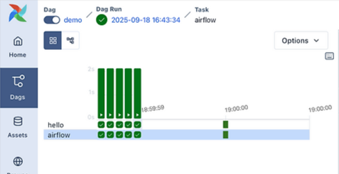 위의 그림은 동일한 DAG가 시간이 흐름에 따라 multiple 실행되었을 때의 모습이다. (시간에 따른 execution history가 가로로 나열된 모습이다)