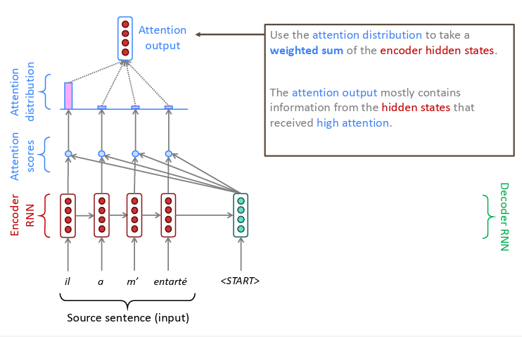 3. 이 attention distribution(가중치)을 이용해서 encoder hidden state의 가중합을 계산한다.